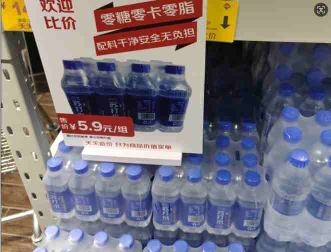 第三類是華冠自有品牌的大幅低價,該店選擇快消飲品作為突破點,打造低價消費印象,占領消費心智。如低至5.9元/組,350ML共12瓶的冠之選蘇打水飲料,單價低至四毛九,作為同比,同樣在飲品區(qū)銷售的某二線品牌360ML蘇打水售價為1.2元/瓶,價格優(yōu)勢極為明顯。