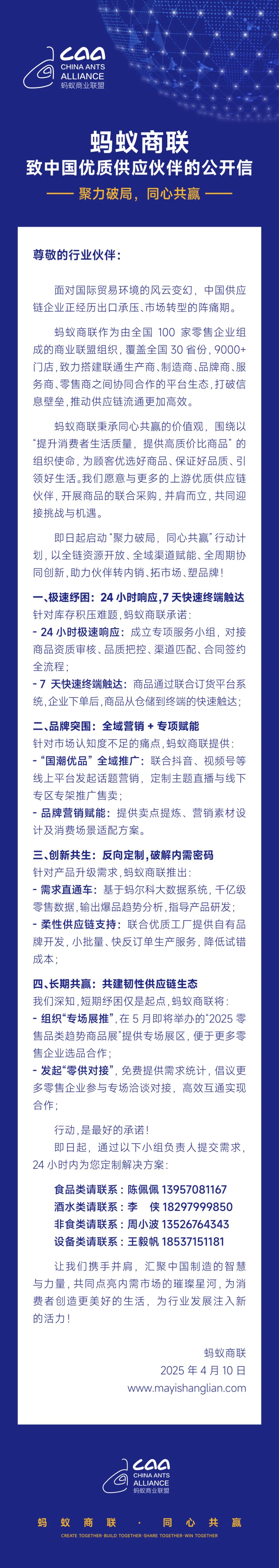 螞蟻商聯(lián)致中國(guó)優(yōu)質(zhì)供應(yīng)伙伴的公開(kāi)信(轉(zhuǎn)自螞蟻商聯(lián))